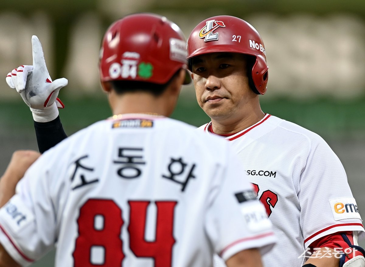 9일 인천 SSG 랜더스필드에서 ‘2023 신한은행 SOL KBO리그’ SSG 랜더스와 NC 다이노스의 경기가 열렸다. 3회말 2사에서 SSG 김강민이 안타를 날린 후 세리머니를 펼치고 있다.