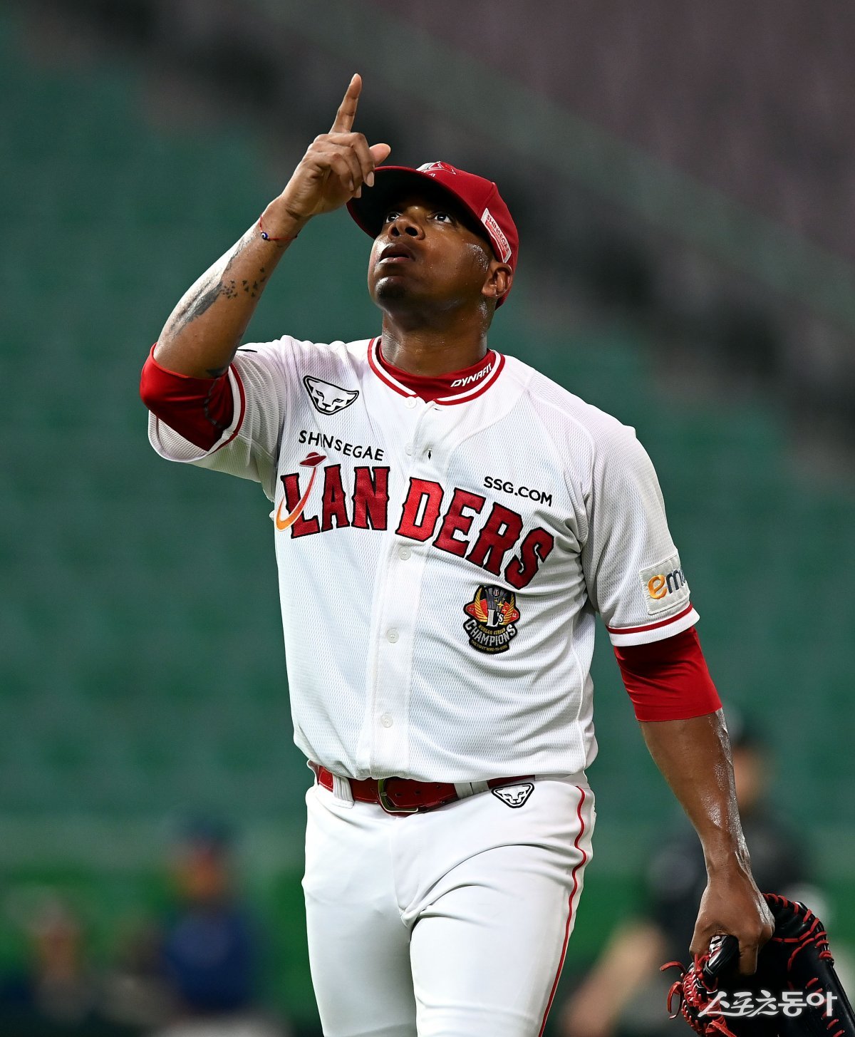 9일 인천 SSG 랜더스필드에서 ‘2023 신한은행 SOL KBO리그’ SSG 랜더스와 NC 다이노스의 경기가 열렸다. SSG 선발 엘리아스가 5회까지 1실점으로 NC 공격을 막은 후 더그아웃으로 향하며 세리머니를 펼치고 있다.