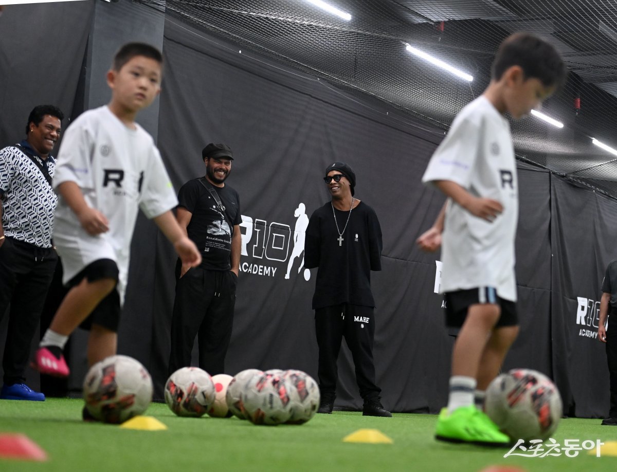 레전드 매치 홍보를 위해 방한한 호나우지뉴가 10일 서울 송파구 풀코진 송파점에서 열린 유소년 축구 클리닉에 참석해 유소년들의 훈련 모습을 바라보고 있다.