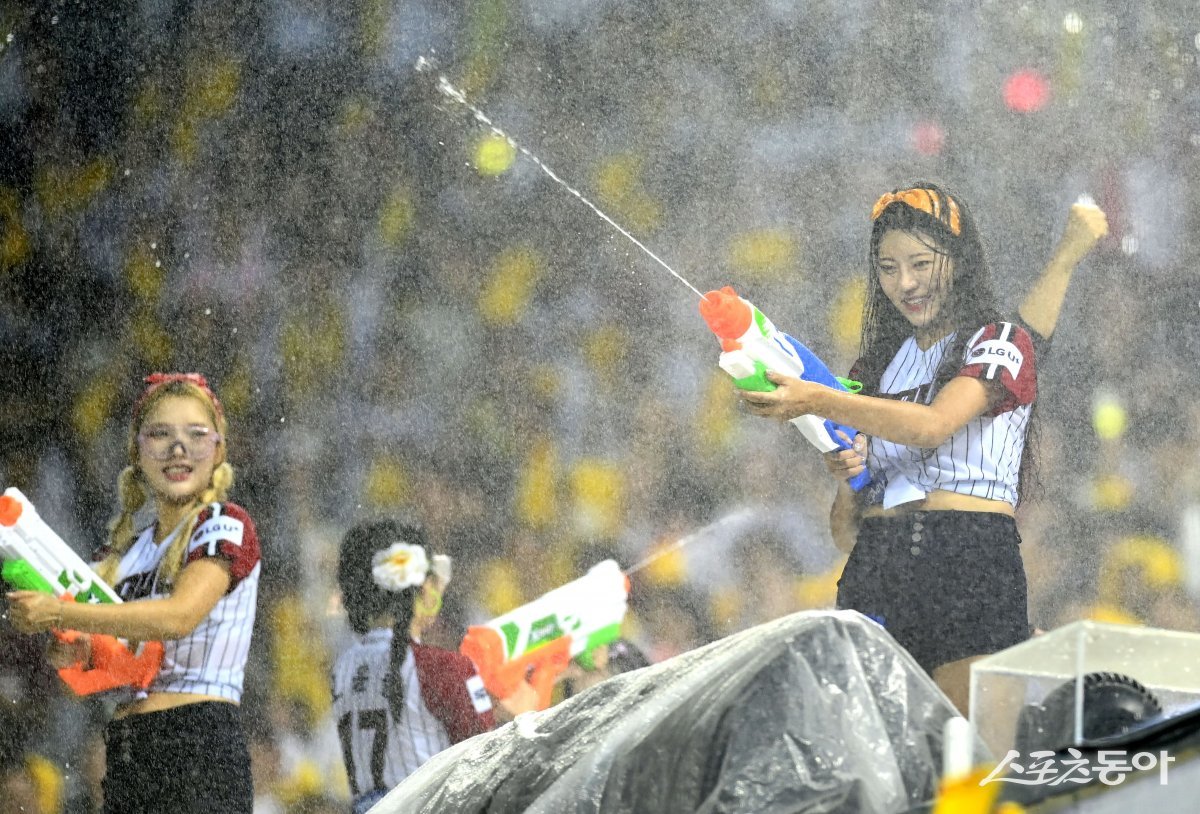 13일 서울 잠실야구장에서 ‘2023 신한은행 SOL KBO리그’ 키움 히어로즈와 LG 트윈스 경기가 열렸다. LG 치어리더가 썸머 홀릭 행사로 물을 뿌리며 응원을 하고 있다.
