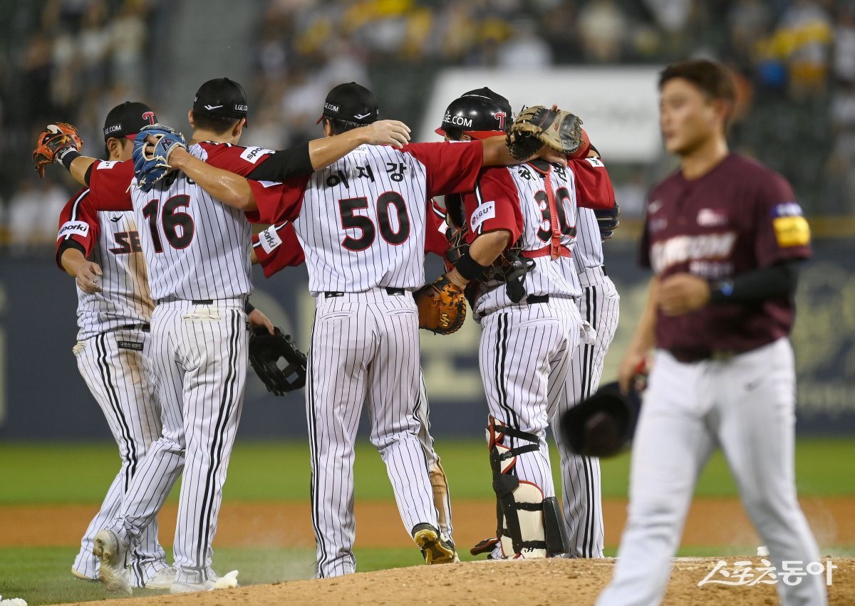 13일 서울 잠실야구장에서 ‘2023 신한은행 SOL KBO리그’ 키움 히어로즈와 LG 트윈스 경기가 열렸다. 17-8 대승을 거둔 후 LG 선수들이 기뻐하고 있다.