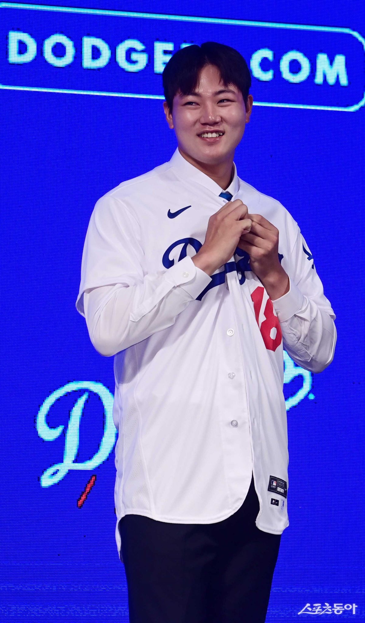 마산용마고 장현석이 14일 서울 용산구 서울드래곤시티호텔에서 열린 메이저리그 LA 다저스 입단 기자회견에서 유니폼을 입고 있다.