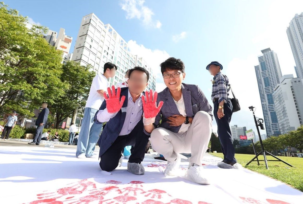 임정환 지부장이 지난 8월 11일 부산 송상현광장에서 열린 나라사랑 평화나눔 행사에서 대형 태극기에 손도장을 찍고 기념촬영을 하고 있다. 사진제공ㅣ신천지자원봉사단 부산서부지부