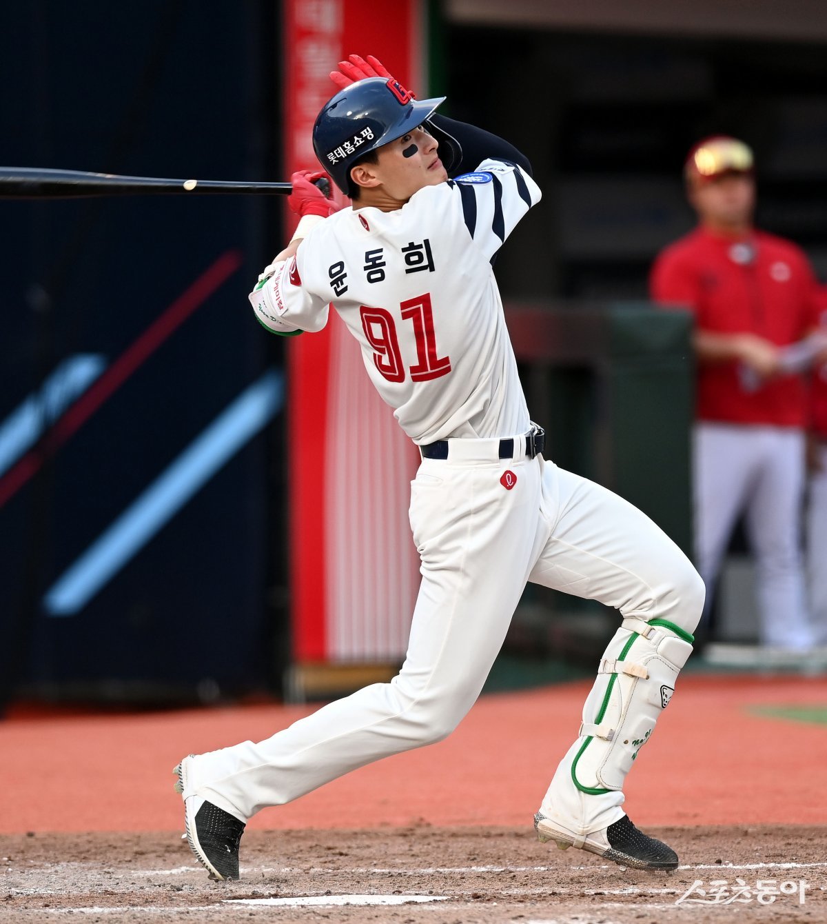 15일 부산 사직야구장에서 ‘2023 신한은행 SOL KBO리그’ 롯데 자이언츠와 SSG 랜더스 경기가 열렸다. 4회말 1사 만루에서 롯데 윤동희가 희생플라이를 날리고 있다.