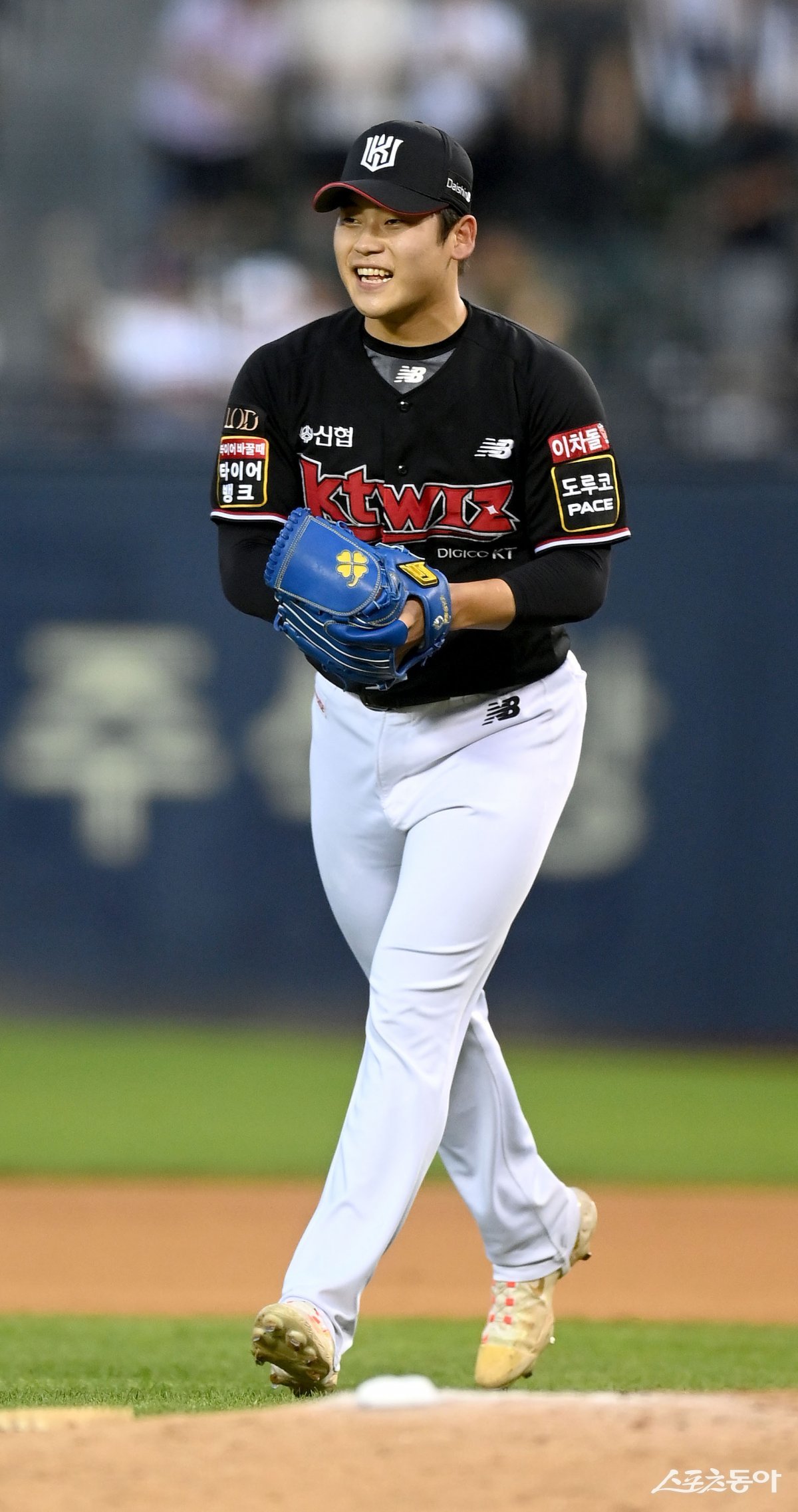 15일 서울 잠실야구장에서 ‘2023 신한은행 SOL KBO리그’ KT 위즈와 두산 베어스 경기가 열렸다. 교체 등판한 KT 박영현이 8회말 두산의 공격을 무실점으로 막은 후 기뻐하고 있다.