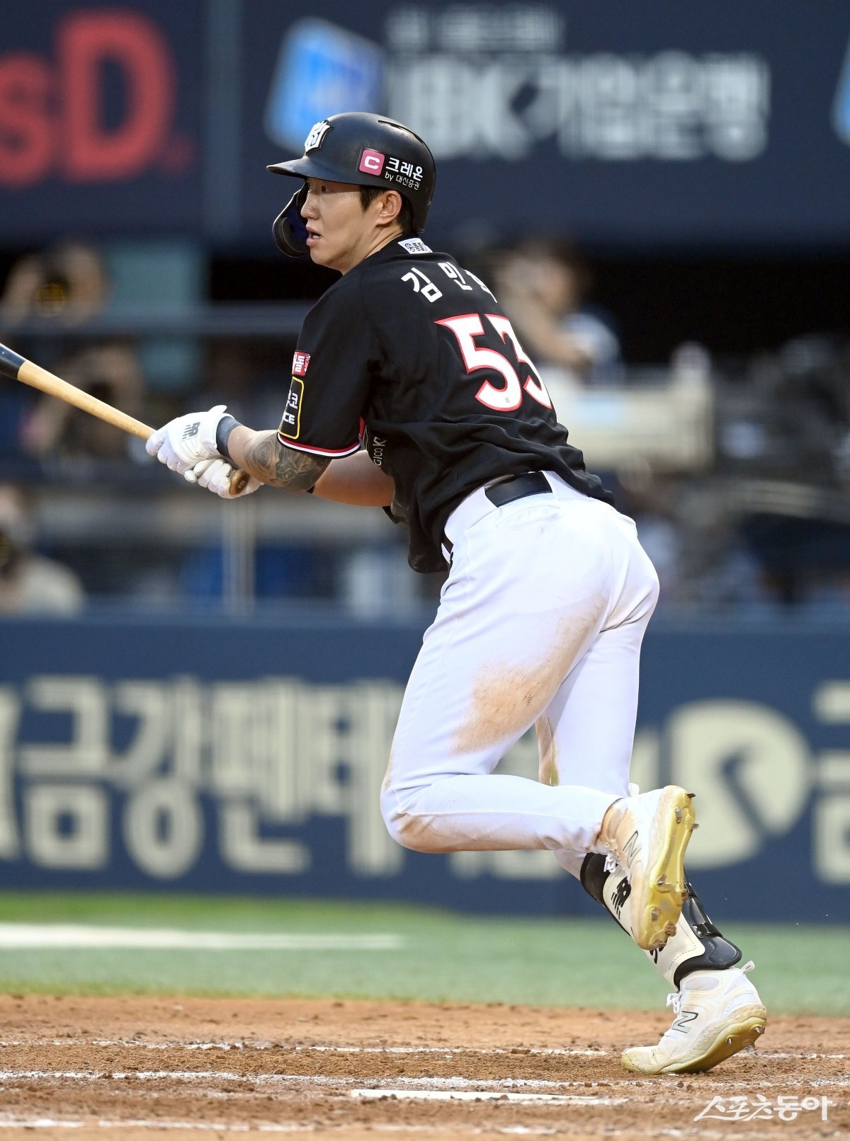 15일 서울 잠실야구장에서 ‘2023 신한은행 SOL KBO리그’ KT 위즈와 두산 베어스 경기가 열렸다. 8회초 2사 2루 KT 김민혁이 선제 1타점 좌중전 3루타를 치고 있다.