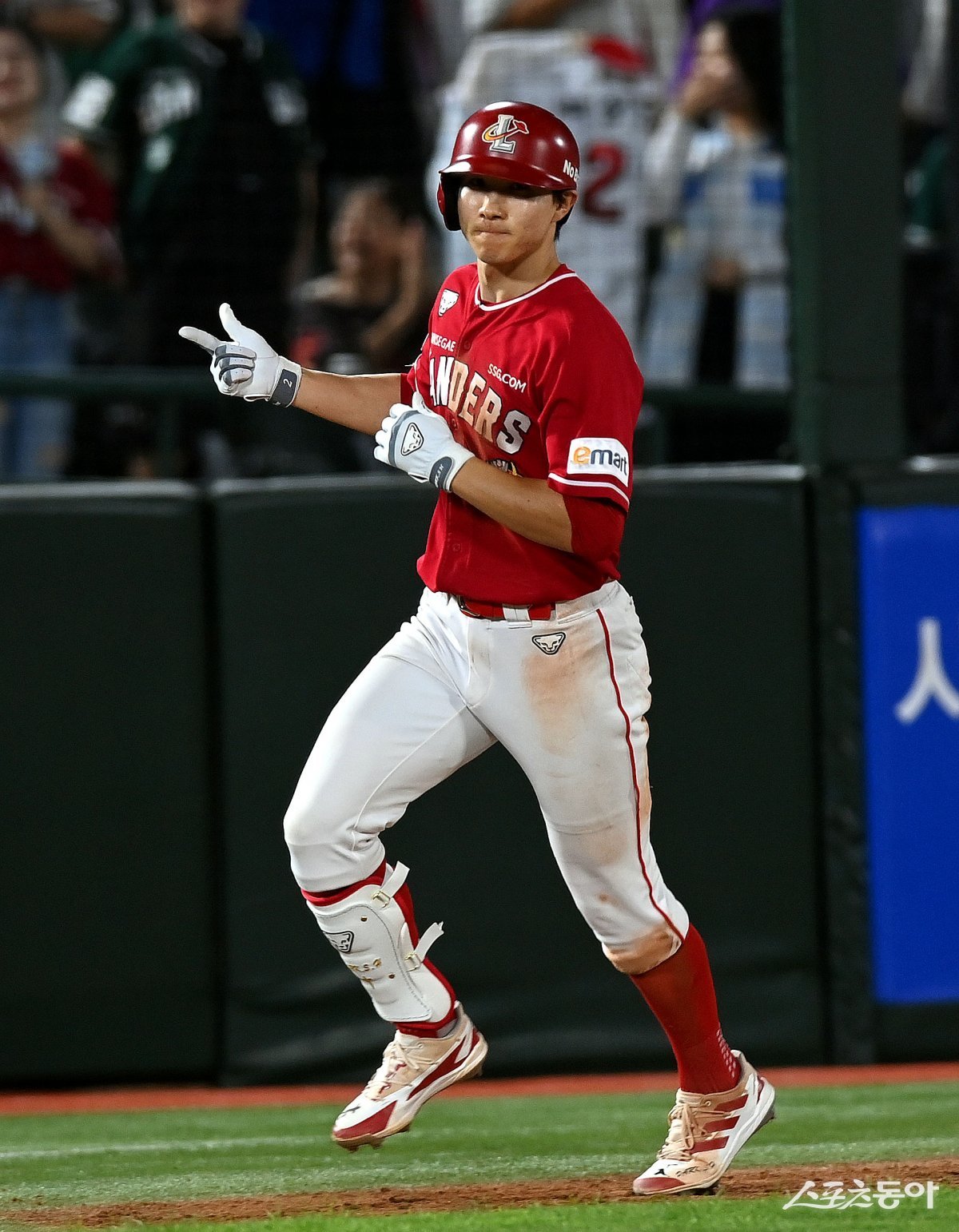15일 부산 사직야구장에서 ‘2023 신한은행 SOL KBO리그’ 롯데 자이언츠와 SSG 랜더스 경기가 열렸다. 8회초 무사 2루에서 SSG 박성한이 투런 홈런을 쏘아 올린 후 그라운드를 돌며 세리머니를 펼치고 있다.