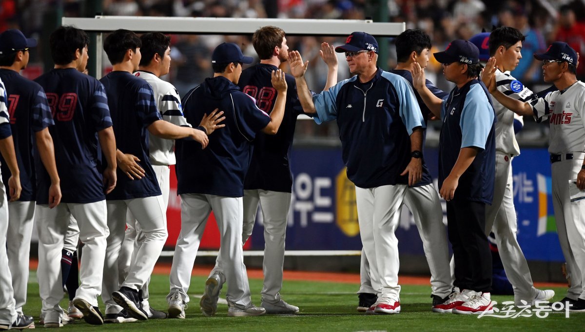 15일 부산 사직야구장에서 ‘2023 신한은행 SOL KBO리그’ 롯데 자이언츠와 SSG 랜더스 경기가 열렸다. 롯데가 SSG를 상대로 10-6 승리를 거둔 후 선수들이 서튼 감독의 축하를 받고 있다.