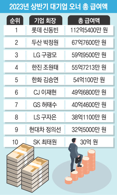 올해 상반기 주요 대기업 그룹 총수 가운데 신동빈 롯데그룹 회장이 가장 많은 급여를 받은 것으로 나타났다.2위는 박정원, 67억7600만원 수령