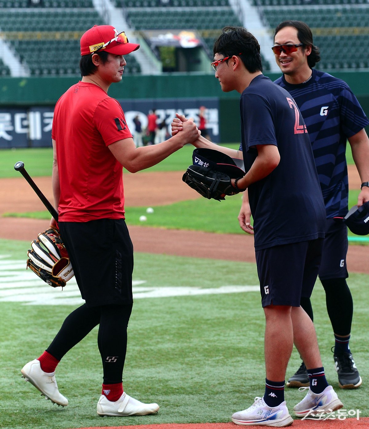 16일 부산 사직야구장에서 ‘2023 신한은행 SOL KBO리그’ 롯데 자이언츠와 SSG 랜더스 경기가 열린다. 경기 전 롯데 박세웅이 SSG 최정과 인사를 나누고 있다.