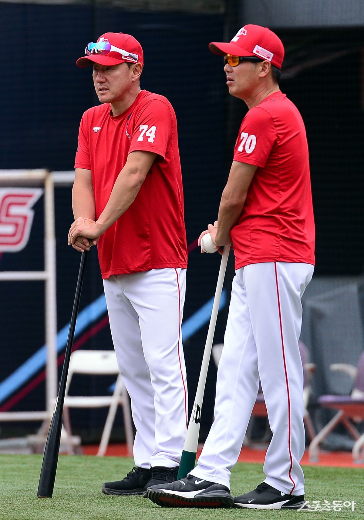16일 부산 사직야구장에서 ‘2023 신한은행 SOL KBO리그’ 롯데 자이언츠와 SSG 랜더스 경기가 열린다. 경기 전 SSG 김원형 감독과 조원우 코치가 훈련을 지켜보고 있다.