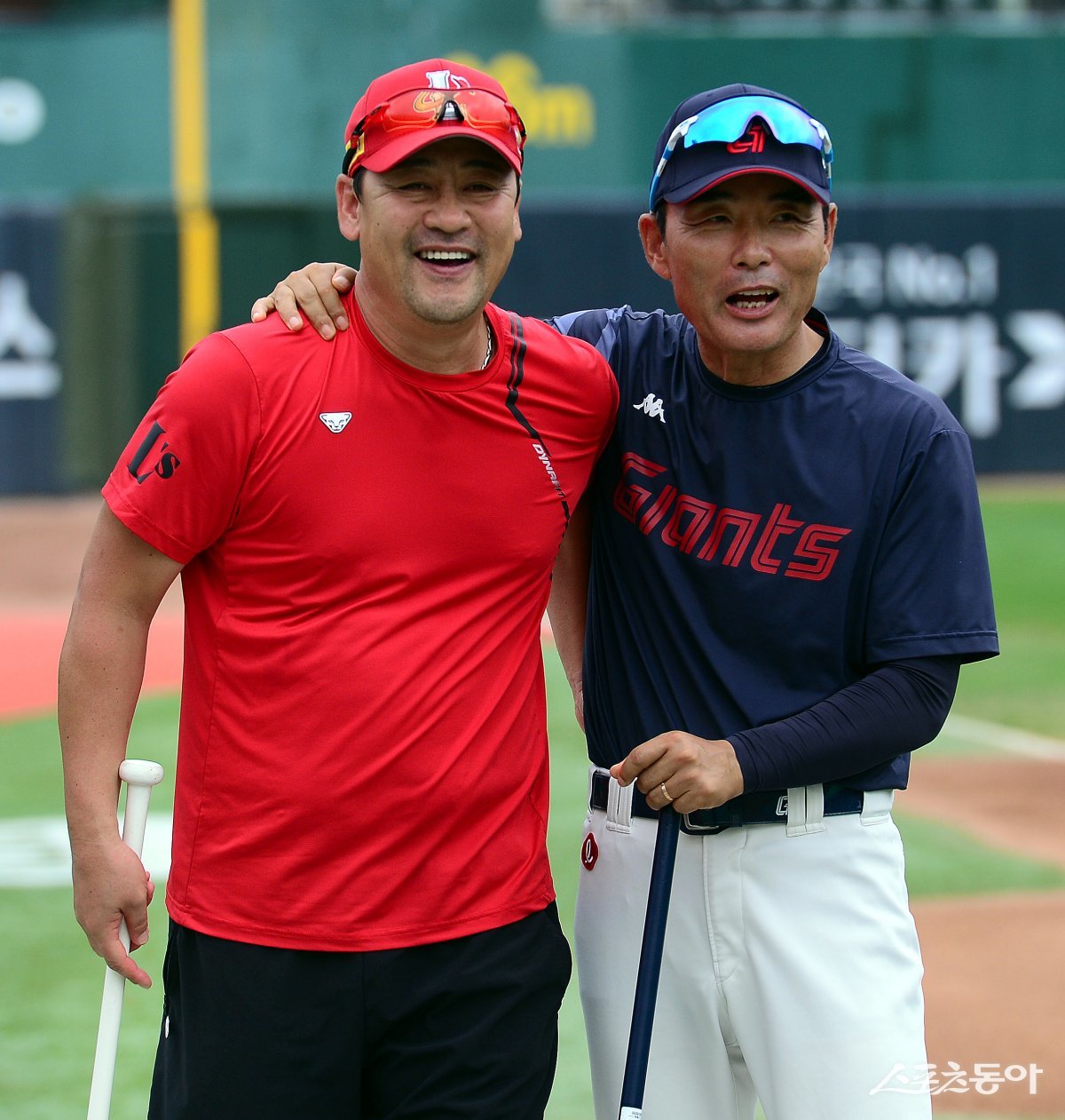 16일 부산 사직야구장에서 ‘2023 신한은행 SOL KBO리그’ 롯데 자이언츠와 SSG 랜더스 경기가 열린다. 경기 전 SSG 김민재 코치와 롯데 이종운 코치가 이야기를 나누고 있다.