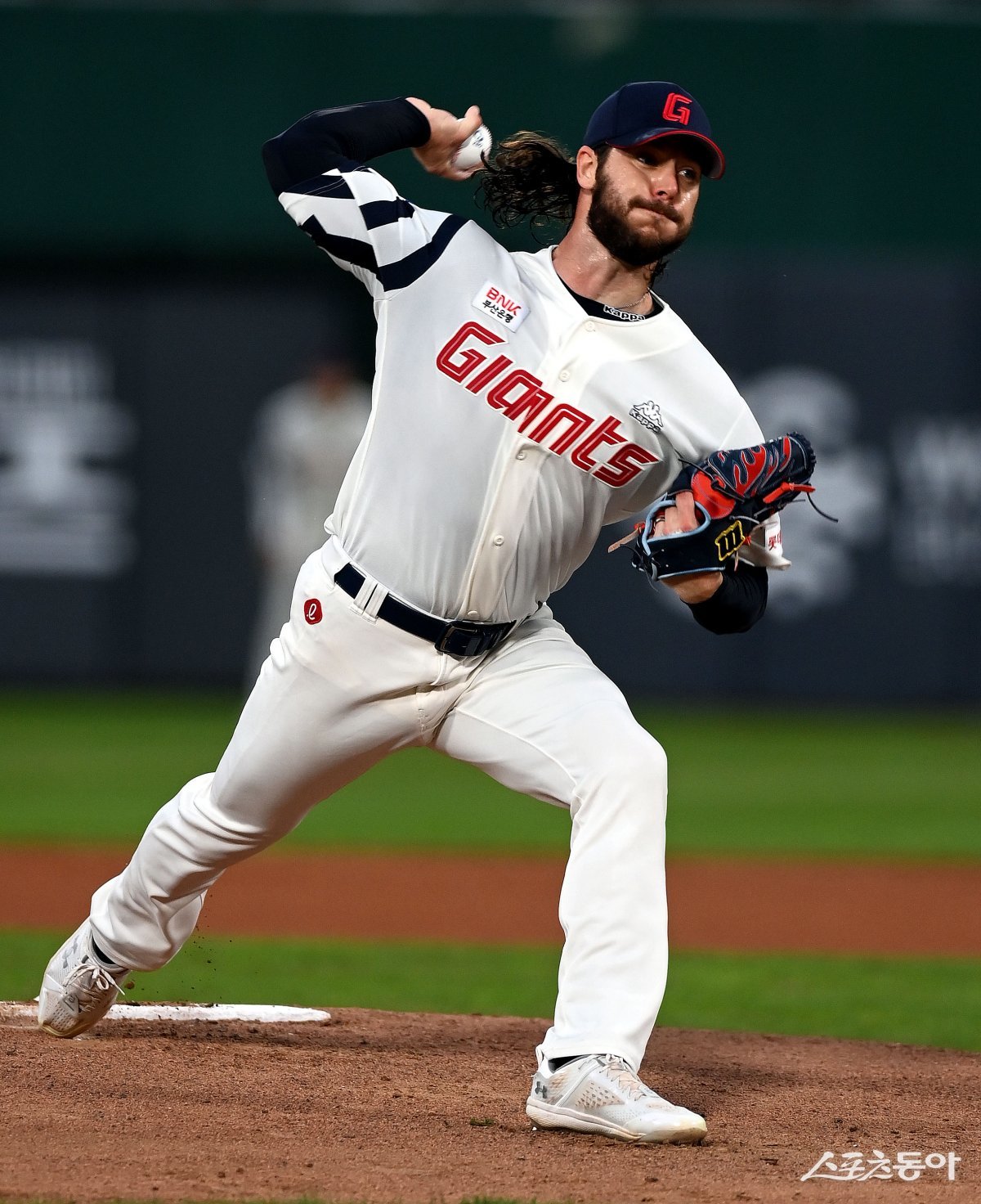 16일 부산 사직야구장에서 ‘2023 신한은행 SOL KBO리그’ 롯데 자이언츠와 SSG 랜더스 경기가 열렸다. 롯데 선발투수 윌커슨이 힘차게 볼을 던지고 있다.