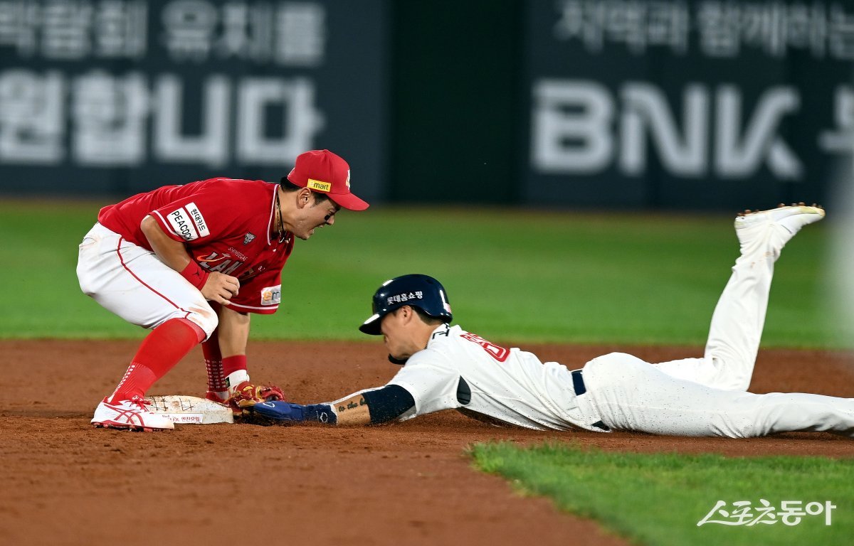 16일 부산 사직야구장에서 ‘2023 신한은행 SOL KBO리그’ 롯데 자이언츠와 SSG 랜더스 경기가 열렸다. 2회말 1사 1루에서 SSG 최주환이 2루 도루를 시도하던 롯데 고승민을 태그 아웃시키고 있다.
