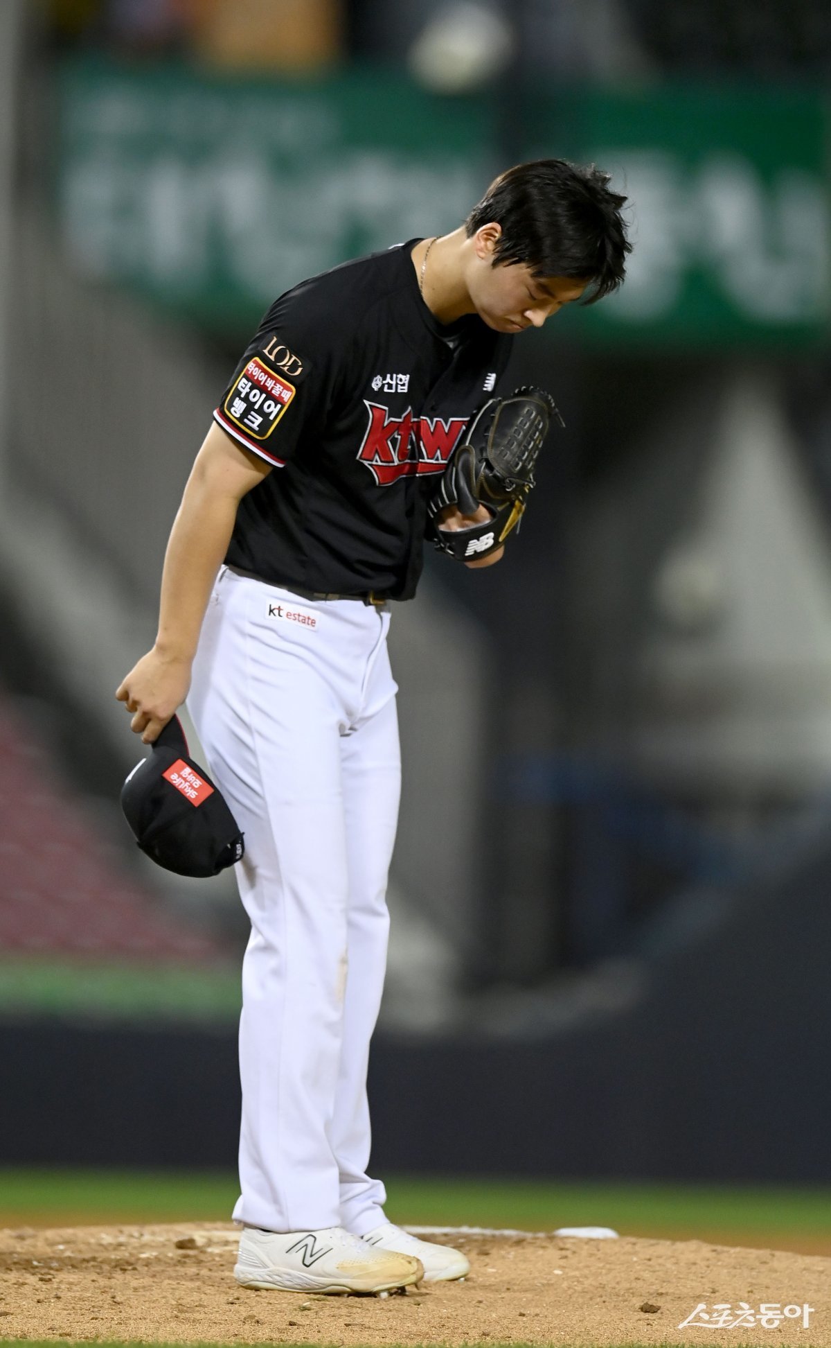 16일 서울 잠실야구장에서 ‘2023 신한은행 SOL KBO리그’ KT 위즈와 두산 베어스 경기가 열렸다. 5회말 무사 KT 선발 엄상백이 두산 양석환을 몸에 맞는 볼로 출루시킨 후 사과하고 있다.