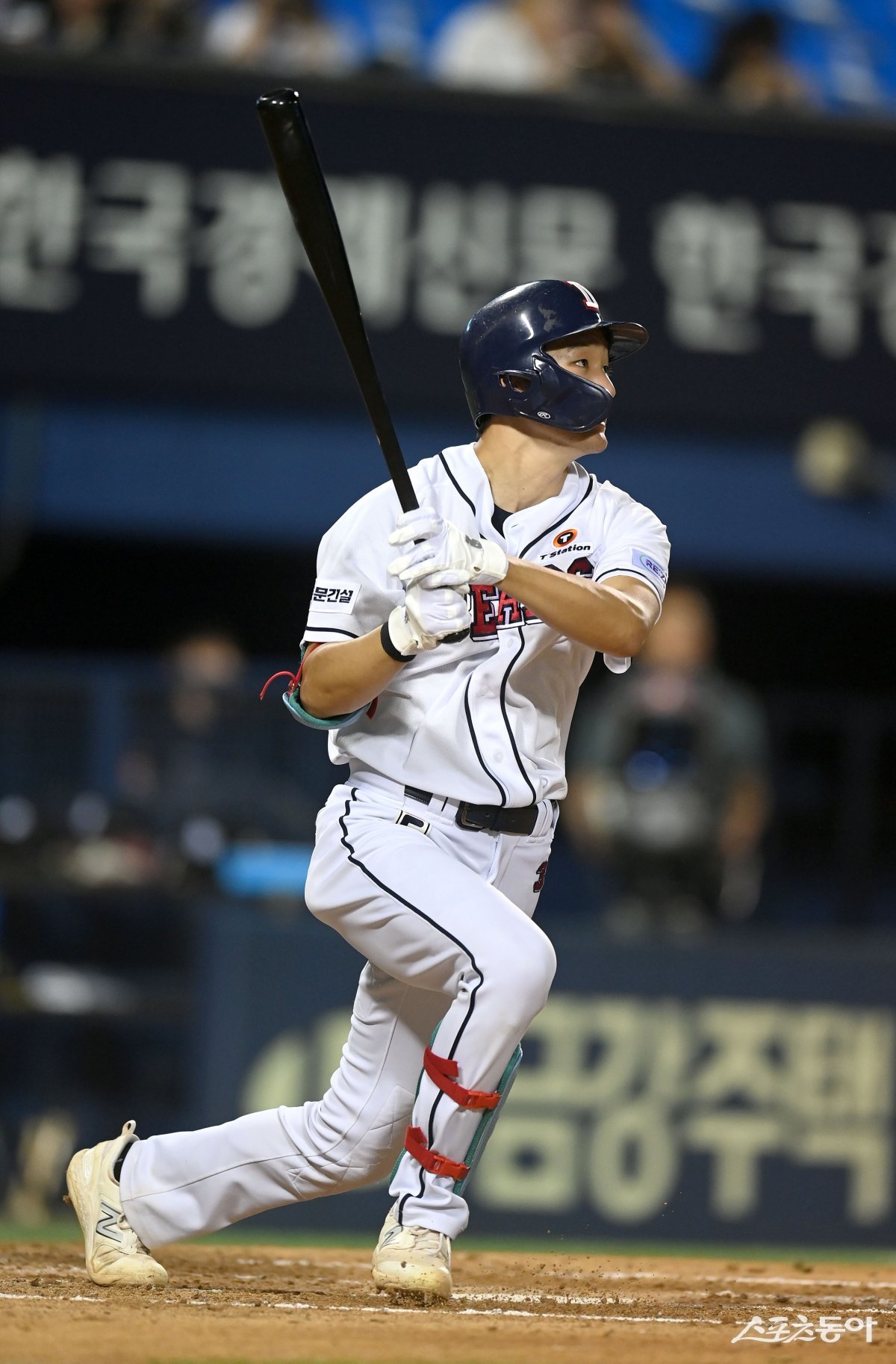 16일 서울 잠실야구장에서 ‘2023 신한은행 SOL KBO리그’ KT 위즈와 두산 베어스 경기가 열렸다. 4회말 무사 두산 안재석이 우중전 3루타를 치고 있다.