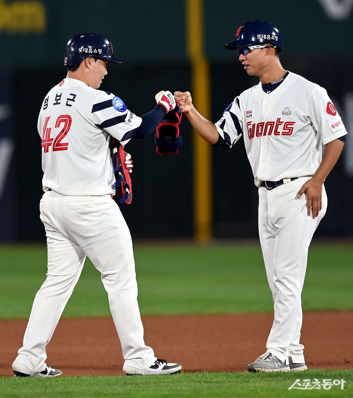 16일 부산 사직야구장에서 ‘2023 신한은행 SOL KBO리그’ 롯데 자이언츠와 SSG 랜더스 경기가 열렸다. 6회말 1사 1루에서 롯데 대타 정보근이 1타점 2루타를 날린 후 코치의 환영을 받고 있다.