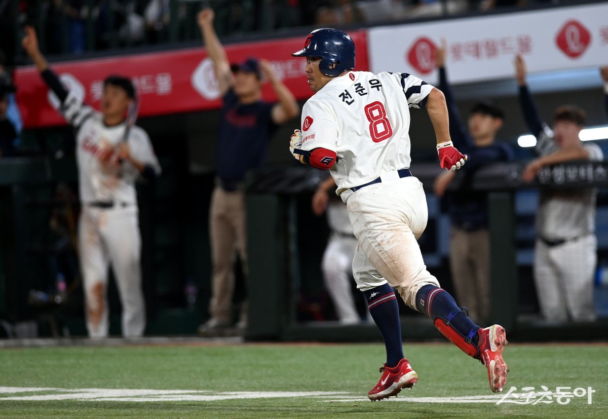 16일 부산 사직야구장에서 ‘2023 신한은행 SOL KBO리그’ 롯데 자이언츠와 SSG 랜더스 경기가 열렸다. 5회말 2사 1, 2루에서 롯데 전준우가 역전 3점 홈런을 쏘아 올린 후 그라운드를 돌고 있다.
