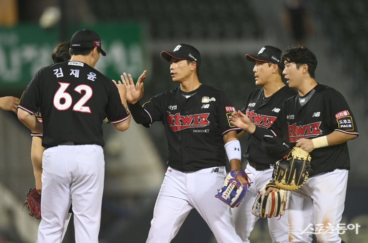 16일 서울 잠실야구장에서 ‘2023 신한은행 SOL KBO리그’ KT 위즈와 두산 베어스 경기가 열렸다. 5-2 승리를 거두며 4연승을 달린 KT 선수들이 하이파이브 하고 있다.