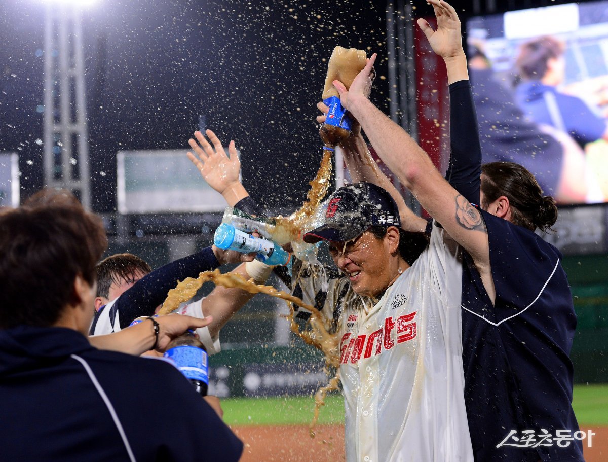 16일 부산 사직야구장에서 ‘2023 신한은행 SOL KBO리그’ 롯데 자이언츠와 SSG 랜더스 경기가 열렸다. 롯데 김원중이 개인통산 100세이브를 달성한 후 동료들의 축하를 받고 있다.
