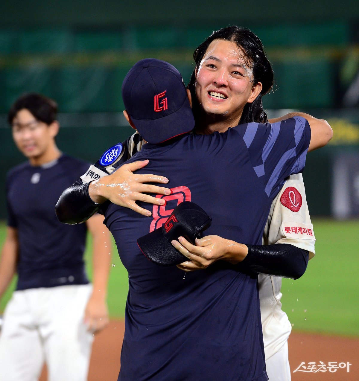 16일 부산 사직야구장에서 ‘2023 신한은행 SOL KBO리그’ 롯데 자이언츠와 SSG 랜더스 경기가 열렸다. 롯데 김원중이 개인통산 100세이브를 달성한 후 전준우의 축하를 받고 있다.