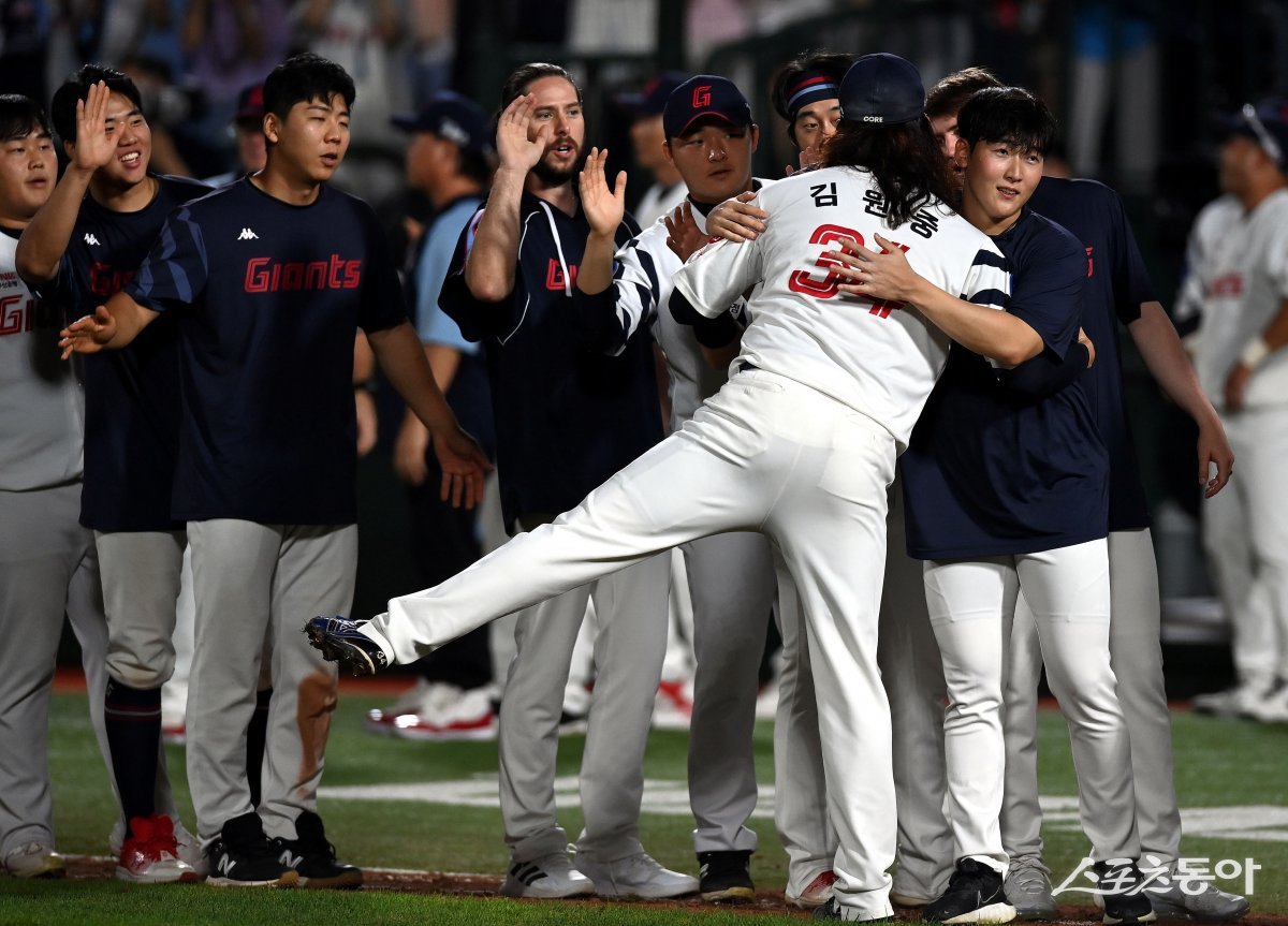 16일 부산 사직야구장에서 ‘2023 신한은행 SOL KBO리그’ 롯데 자이언츠와 SSG 랜더스 경기가 열렸다. 롯데가 SSG를 상대로 7-4 승리한 후 개인통산 100세이브를 달성한 김원중이 동료들의 축하를 받고 있다.