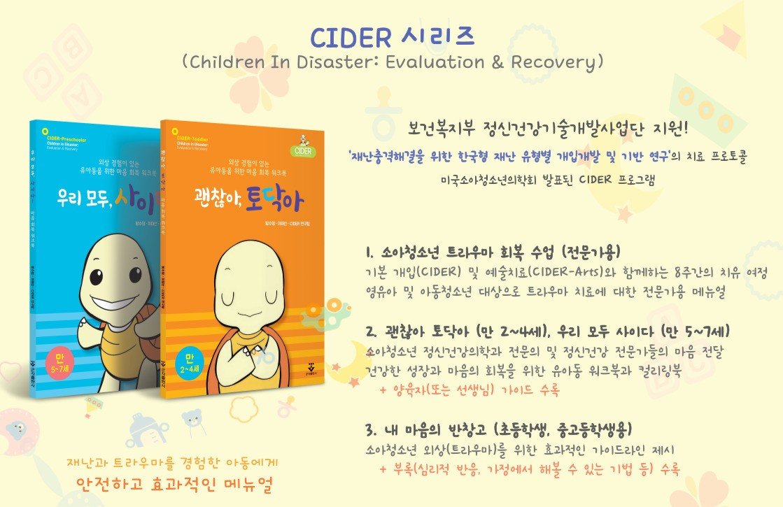 이번에 출간한 도서는 소아 재난 기본 치료(CIDER) 시리즈다. 유, 아동부터 초중고등학생까지 발달단계에 맞춘 시리즈 형태로 소아청소년 트라우마 회복 수업(전문가용), 괜찮아 토닥아(만 2~4세), 우리 모두 사이다(만 5~7세), 내 마음의 반창고(초등학생·중고등학생용) 등 5권이다.