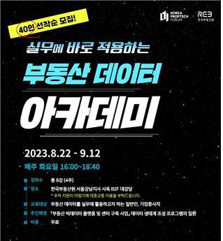 한국부동산원은 오는 22일부터 9월 12일까지 매주 화요일 한국부동산원 서울강남지사 사옥 대강당에서 ‘2023년 제1차 부동산 데이터 아카데미(이하 ‘부동산 데이터 아카데미’)’를 한국프롭테크포럼과 공동으로 개최한다고 17일 밝혔다.