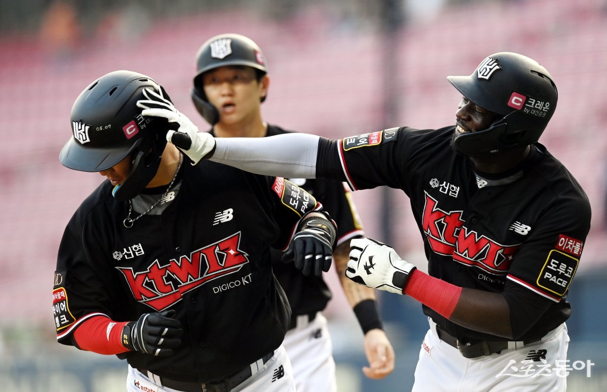 17일 서울 잠실야구장에서 ‘2023 신한은행 SOL KBO리그’ 두산 베어스와 kt 위즈의 경기가 열린다. 1회초 1사 1, 2루에서 kt 장성우가 3점 홈런을 쏘아 올린 후 동료의 환영을 받고 있다.