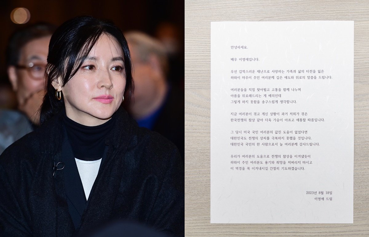 이영애는 편지를 통해 “한국전쟁 당시 미국 국민 여러분의 도움으로 전쟁의 참상을 이겨낼 수 있었다. 대한민국 국민의 한 사람으로서 항상 감사하게 생각한다”며 “갑작스러운 재난으로 가족과 삶의 터전을 잃은 하와이 주민분들이 용기와 희망을 잃지 않고 역경을 이겨내길 기도하겠다”고 위로와 격려의 뜻을 전했다.