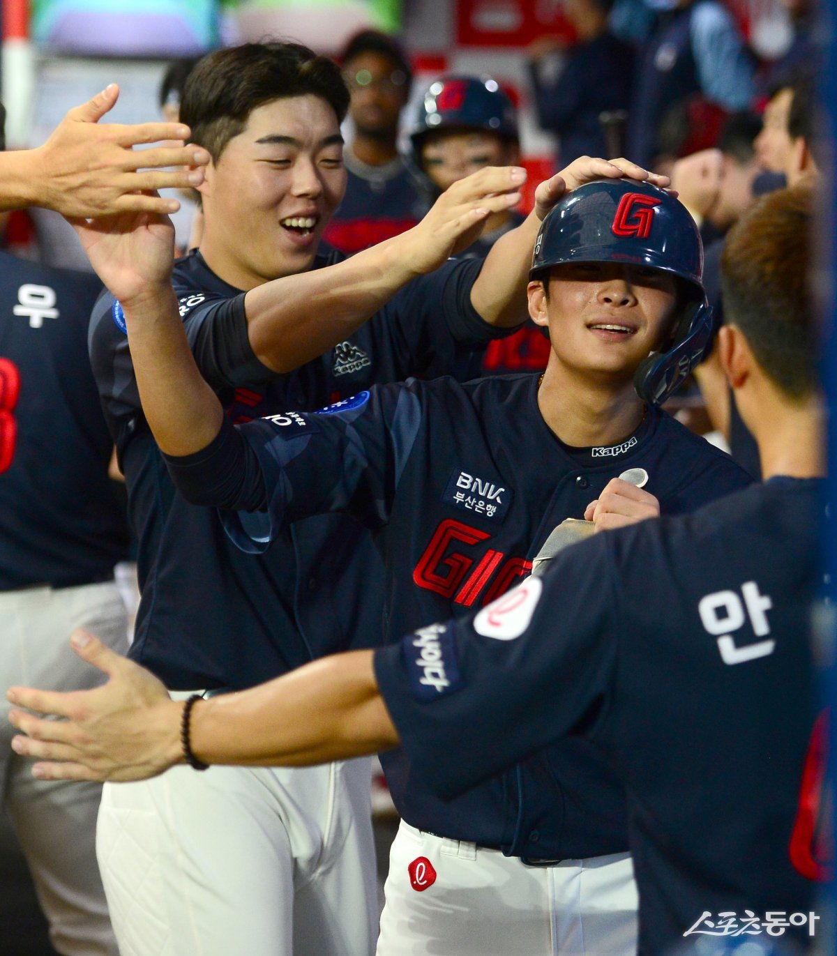 20일 서울 고척스카이돔에서 ‘2023 신한은행 SOL KBO리그’ 롯데 자이언츠와 키움 히어로즈 경기가 열렸다. 4회초 1사 3루 롯데 외야 뜬공 때 3루주자 배영빈이 태그업 시도해 득점에 성공한 후 하이파이브 하고 있다.