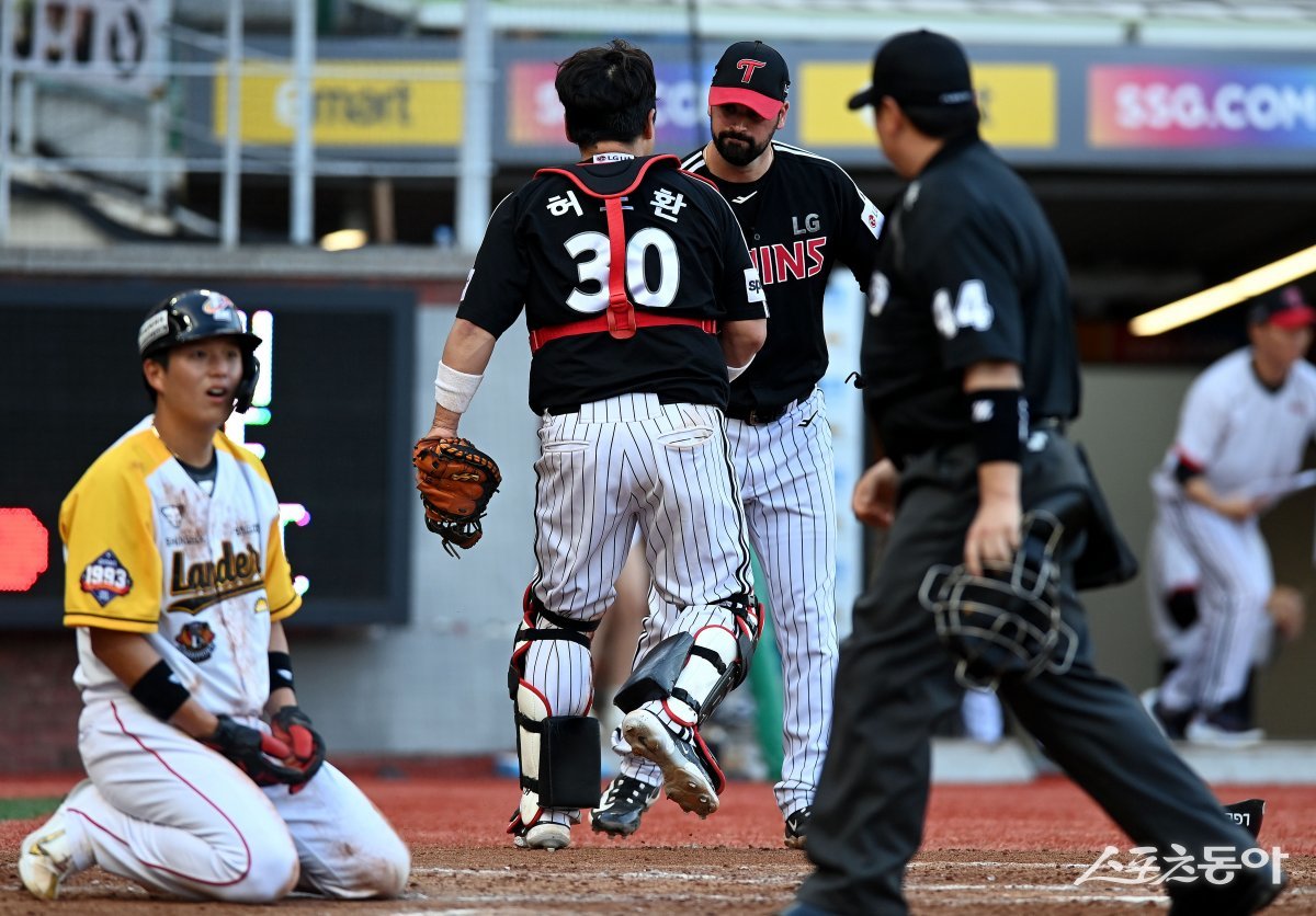 20일 인천 SSG 랜더스필드에서 ‘2023 신한은행 SOL KBO리그’ SSG 랜더스와 LG 트윈스의 경기가 열렸다. 5회말 1사 만루에서 희생플라이 때 SSG 3루 주자 초형우가 홈으로 파고 들었으나 LG 허도환에게 태그 아웃되자 플럿코가 허도환을 환영하고 있다.