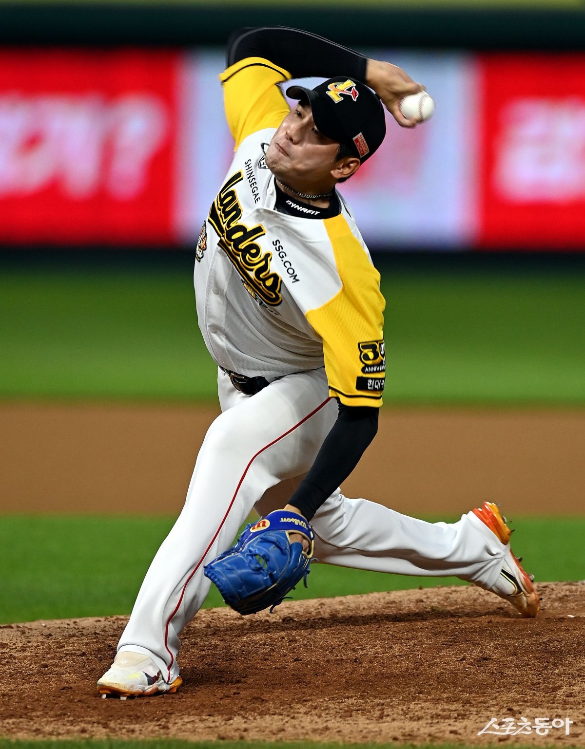20일 인천 SSG 랜더스필드에서 ‘2023 신한은행 SOL KBO리그’ SSG 랜더스와 LG 트윈스의 경기가 열렸다. 9회초 무사에서 SSG 마무리 서진용이 구원 등판해 볼을 던지고 있다.