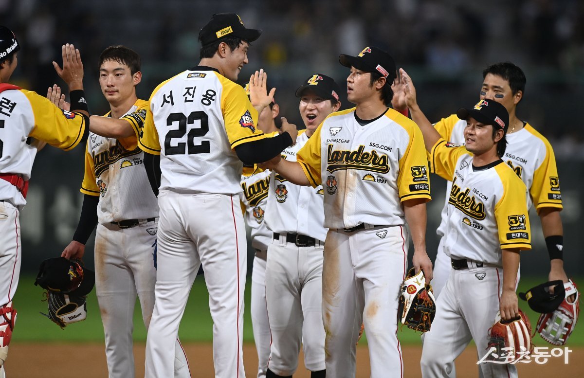 20일 인천 SSG 랜더스필드에서 ‘2023 신한은행 SOL KBO리그’ SSG 랜더스와 LG 트윈스의 경기가 열렸다. SSG가 LG를 상대로 2-1 승리를 거둔 후 선수들이 그라운드에서 기쁨을 나누고 있다.