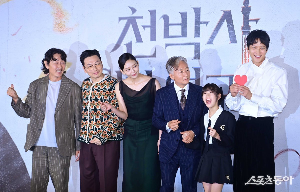 배우 허준호, 이동휘, 이솜, 김종수, 박소이, 강동원이 22일 서울 용산구 CGV 용산아이파크몰점에서 열린 영화 ‘천박사 퇴마연구소: 설경의 비밀’ 제작보고회에서 포즈를 취하고 있다.