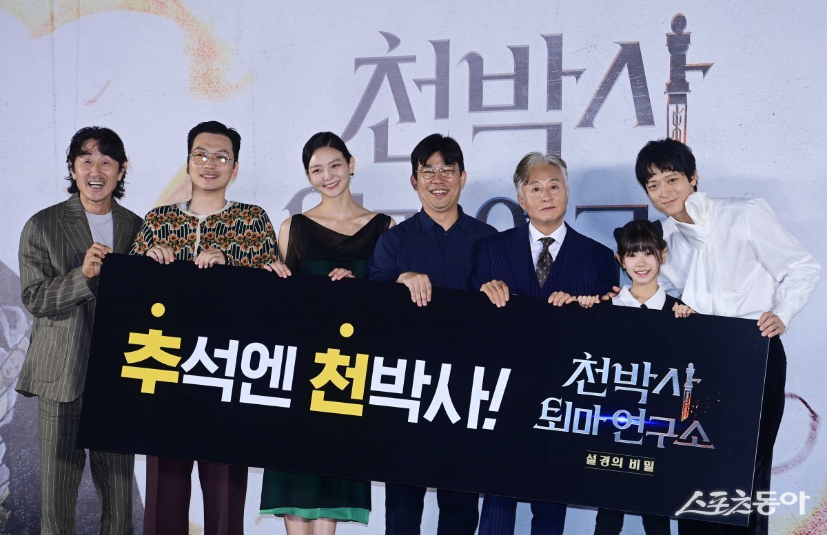 배우 허준호, 이동휘, 이솜, 감독 김성식, 김종수, 박소이, 강동원이 22일 서울 용산구 CGV 용산아이파크몰점에서 열린 영화 ‘천박사 퇴마연구소: 설경의 비밀’ 제작보고회에서 포즈를 취하고 있다.