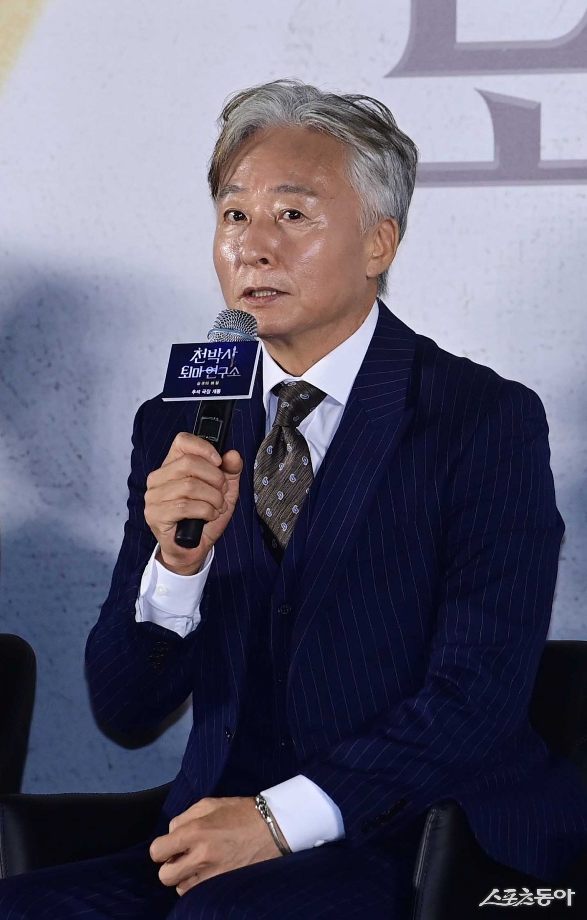배우 김종수가 22일 서울 용산구 CGV 용산아이파크몰점에서 열린 영화 ‘천박사 퇴마연구소: 설경의 비밀’ 제작보고회에서 인사말을 하고 있다.