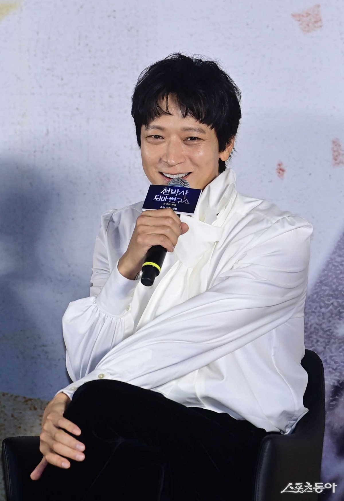 배우 강동원이 22일 서울 용산구 CGV 용산아이파크몰점에서 열린 영화 ‘천박사 퇴마연구소: 설경의 비밀’ 제작보고회에서 인사말을 하고 있다.