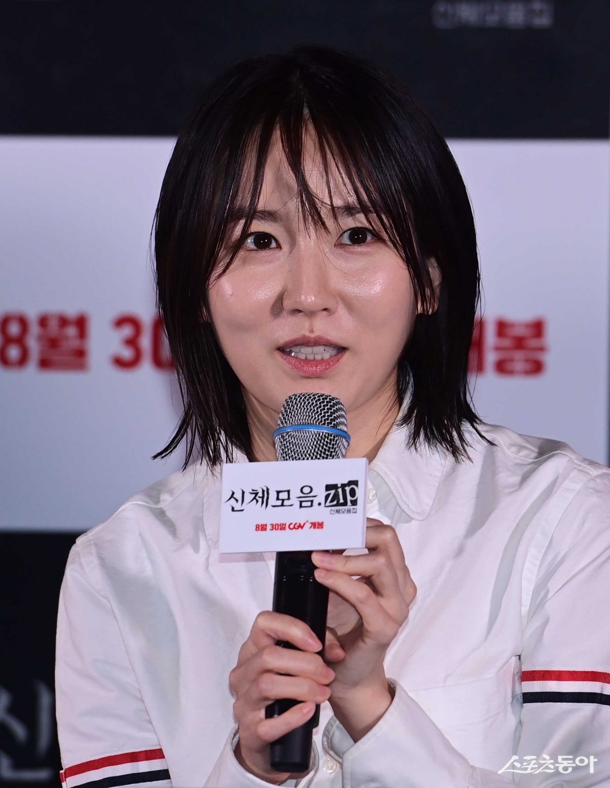 감독 지삼이 22일 서울 용산구 CGV 용산아이파크몰점에서 열린 영화 ‘신체모음.zip’ 언론시사회에서 인사말을 하고 있다.