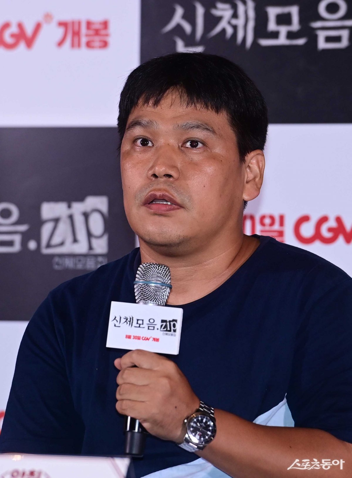감독 전병덕이 22일 서울 용산구 CGV 용산아이파크몰점에서 열린 영화 ‘신체모음.zip’ 언론시사회에서 인사말을 하고 있다.