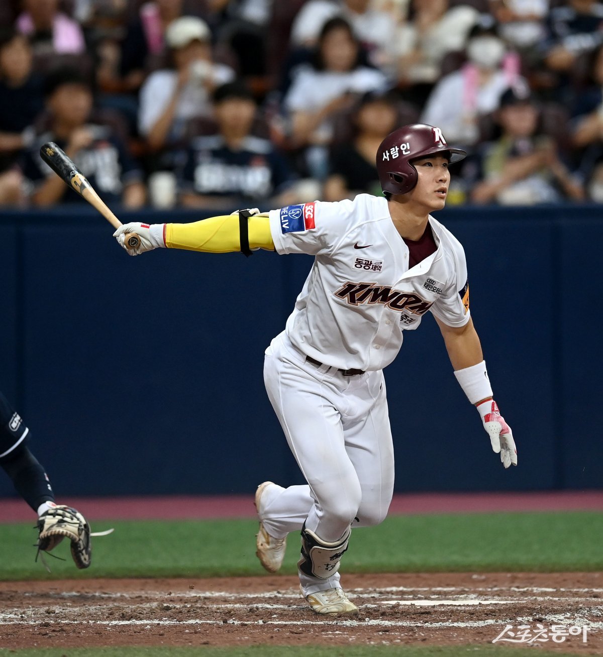 22일 서울 고척스카이돔에서 ‘2023 신한은행 SOL KBO리그’ 두산 베어스와 키움 히어로즈 경기가 열렸다. 5회말 무사 키움 이주형이 우전 안타를 치고 있다.