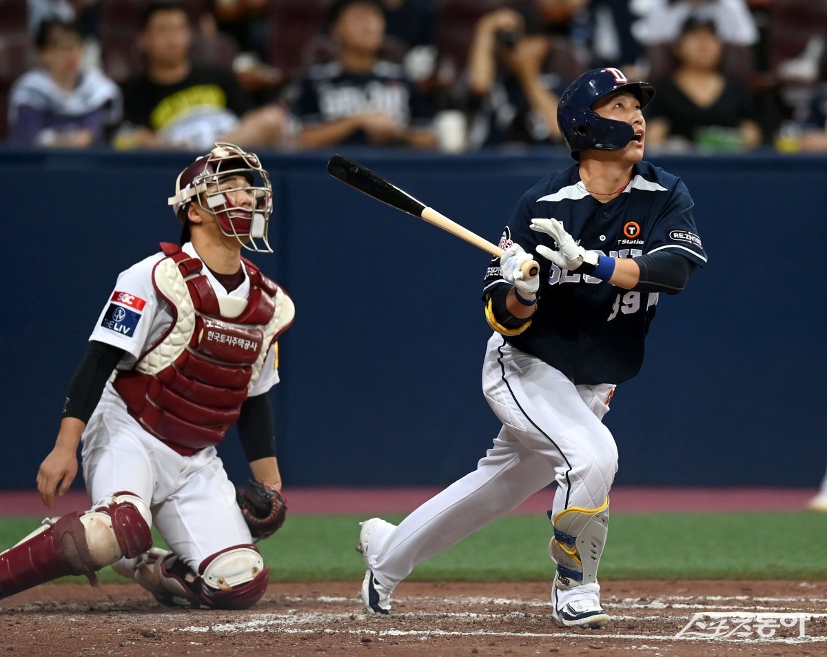 22일 서울 고척스카이돔에서 ‘2023 신한은행 SOL KBO리그’ 두산 베어스와 키움 히어로즈 경기가 열렸다. 3회초 2사 1,3루 두산 김인태가 1타점 우전 안타를 치고 있다.