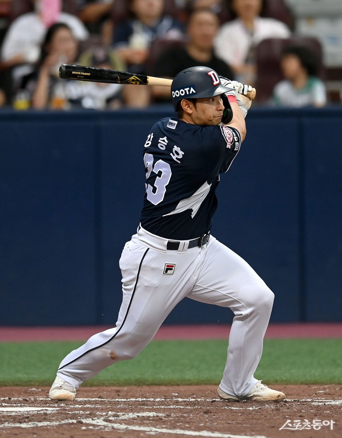 22일 서울 고척스카이돔에서 ‘2023 신한은행 SOL KBO리그’ 두산 베어스와 키움 히어로즈 경기가 열렸다. 3회초 2사 2,3루 두산 강승호가 2타점 중전 안타를 치고 있다.