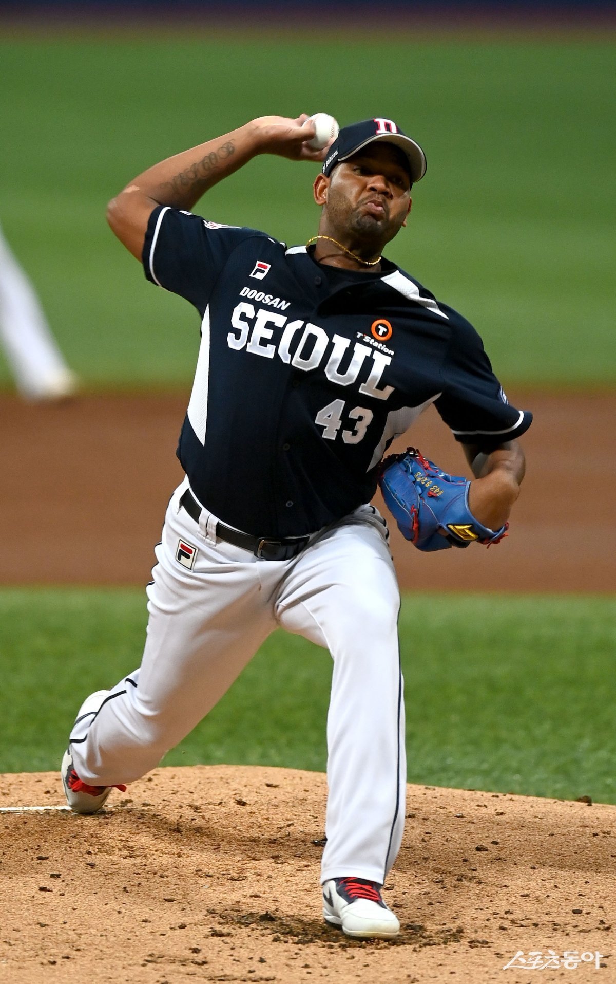 22일 서울 고척스카이돔에서 ‘2023 신한은행 SOL KBO리그’ 두산 베어스와 키움 히어로즈 경기가 열렸다. 선발 투수로 등판한 두산 알칸타라가 역투하고 있다.