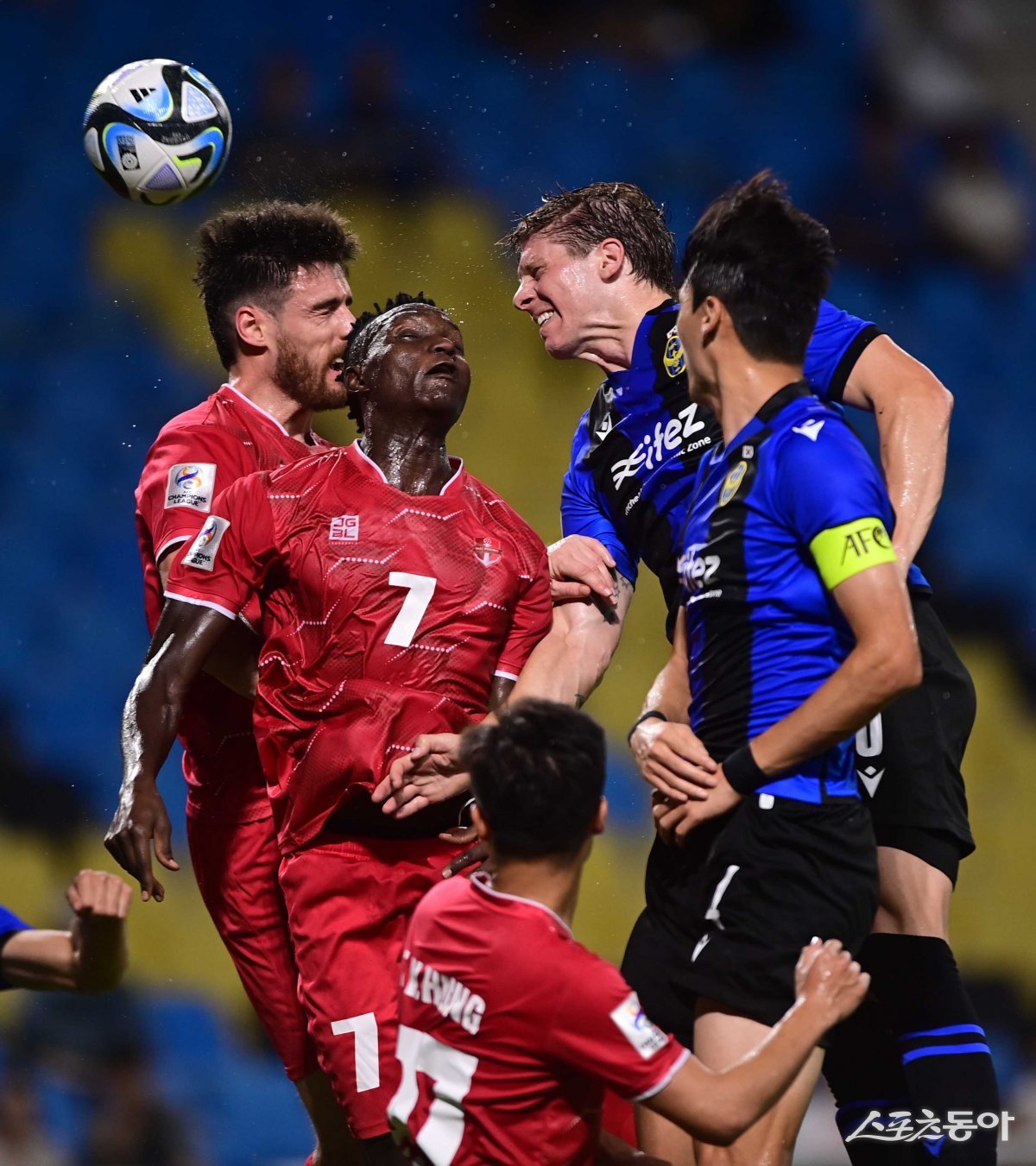 22일 인천축구전용경기장에서 열린 ‘AFC 챔피언스리그 2023-24’ 플레이오프 인천 유나이티드와 하이퐁FC(베트남)의 경기에서 인천 델브리지가 헤딩을 하고 있다.