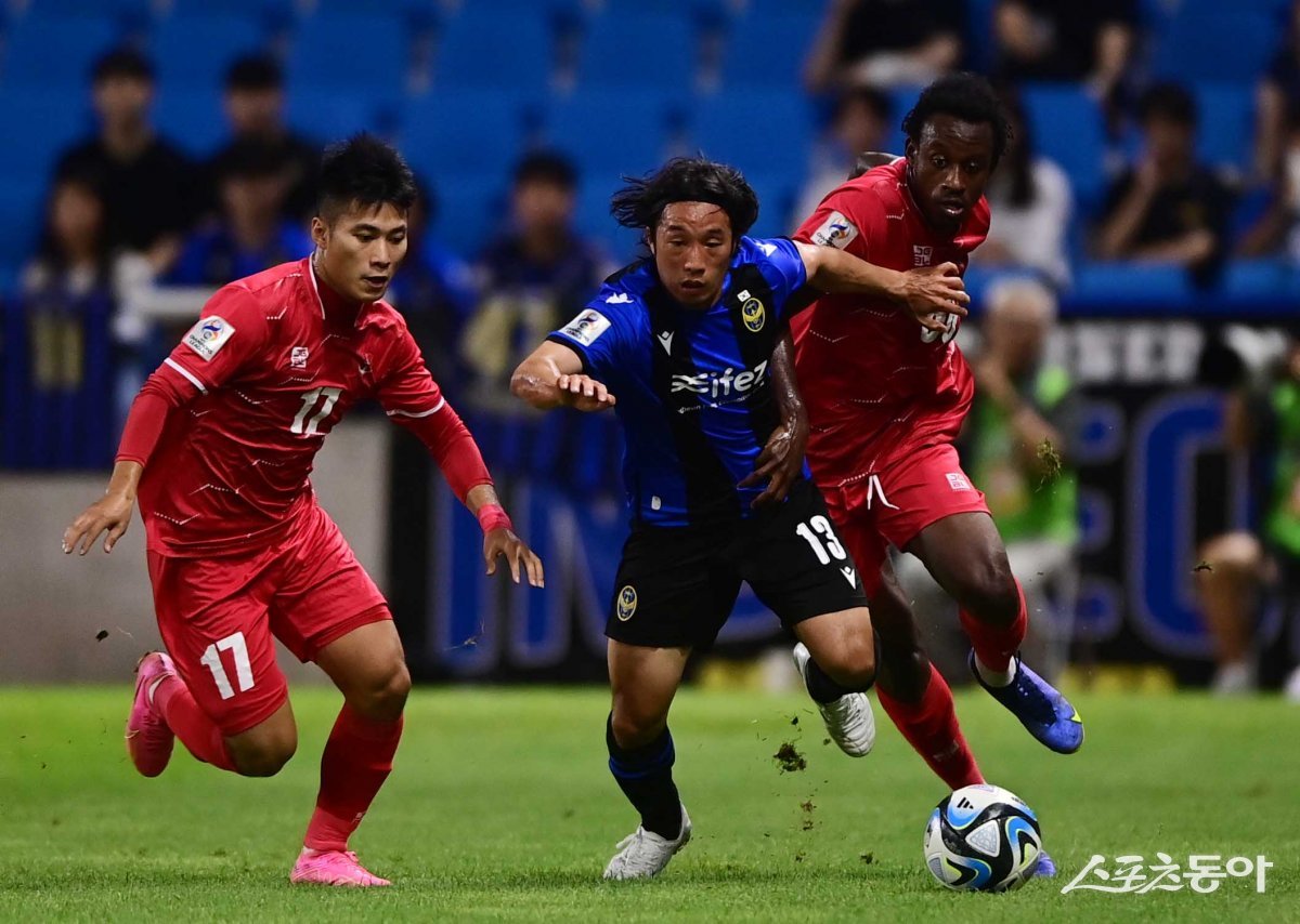 22일 인천축구전용경기장에서 열린 ‘AFC 챔피언스리그 2023-24’ 플레이오프 인천 유나이티드와 하이퐁FC(베트남)의 경기에서 인천 강윤구가 하이퐁 수비 사이에서 드리블 돌파를 하고 있다.