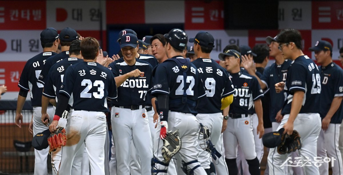 22일 서울 고척스카이돔에서 ‘2023 신한은행 SOL KBO리그’ 두산 베어스와 키움 히어로즈 경기가 열렸다. 6-1 승리를 거둔 두산 이승엽 감독이 선수들과 하이파이브 하고 있다.