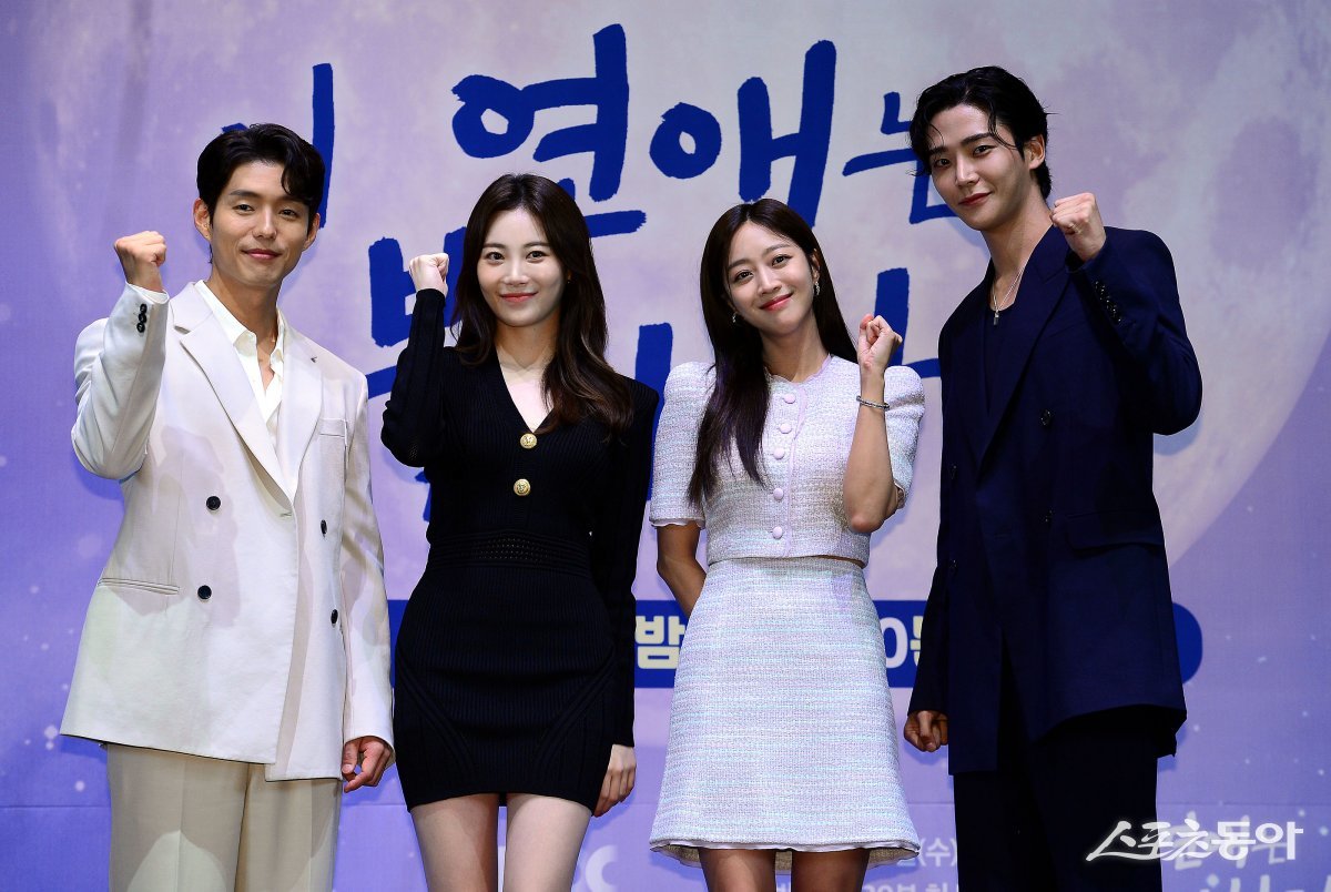 23일 서울 구로구 라마다서울신도림호텔에서 열린 JTBC 수목드라마 ‘이 연애는 불가항력’ 제작발표회에 참석한 하준, 유라, 조보아, 로운이 카메라를 향해 포즈를 취하고 있다.
