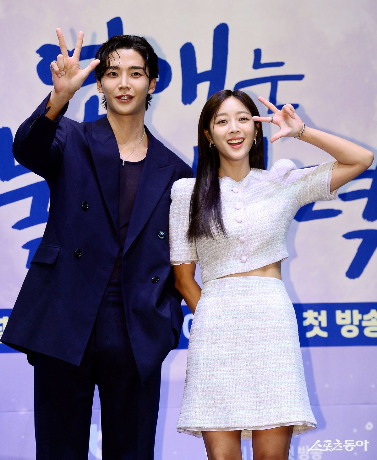 23일 서울 구로구 라마다서울신도림호텔에서 열린 JTBC 수목드라마 ‘이 연애는 불가항력’ 제작발표회에 참석한 로운과 조보아가 카메라를 향해 포즈를 취하고 있다.