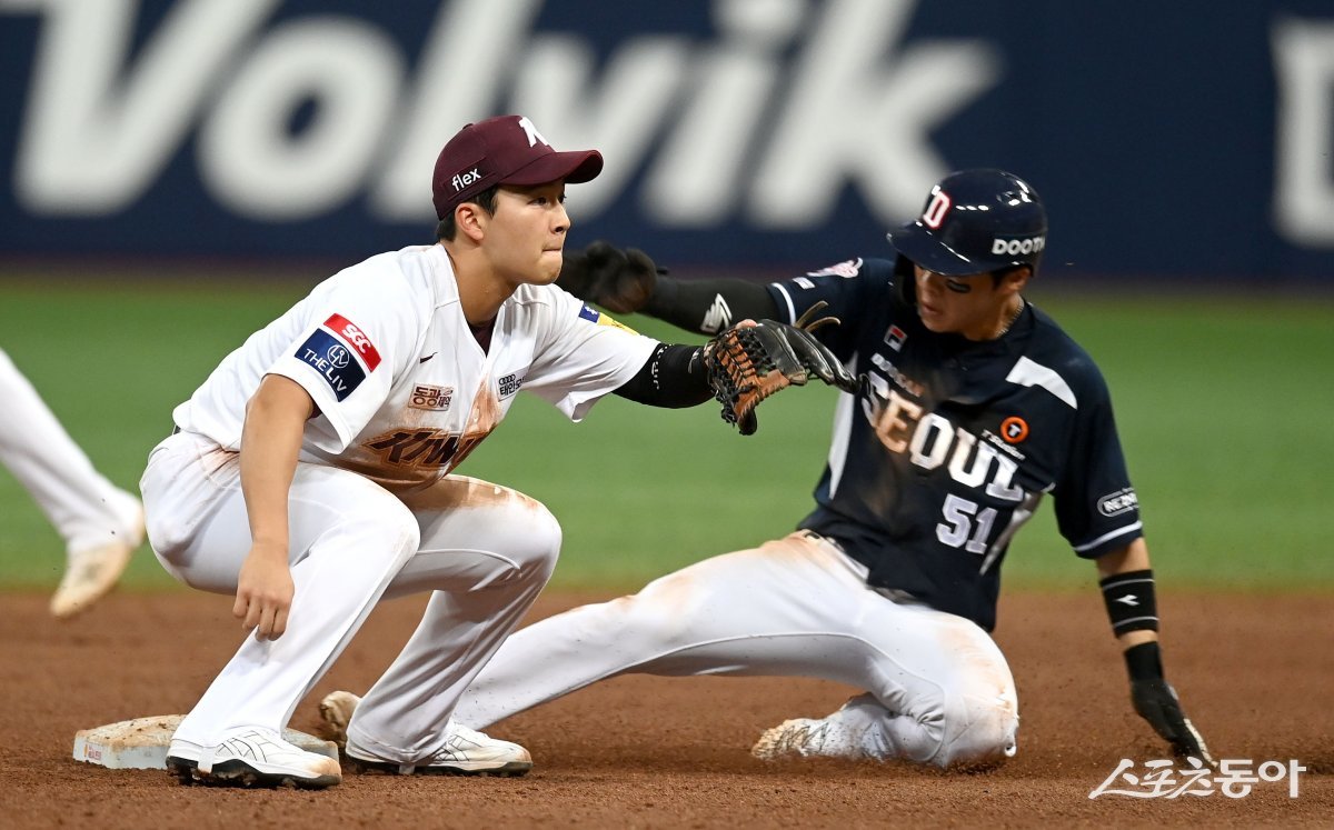 23일 서울 고척스카이돔에서 ‘2023 신한은행 SOL KBO리그’ 두산 베어스와 키움 히어로즈 경기가 열렸다. 5회초 무사 1루 상황에서 두산 1루주자 조수행이 2루 도루에 성공하고 있다.